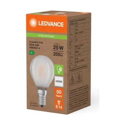 La lampada Ledvance LED Classic E14 Pera Filamento Ghiaccio 1.2W 255lm - 840 Bianco Freddo | Sostitutiva 25W è il sostituto perfetto per le tue vecchie lampade 25W con attacco a vite piccolo E14 grazie alla sua tecnologia LED. Passare a LED ti offrirà molti vantaggi!
