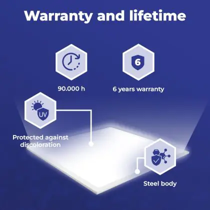 Questo pannello LED ha un ciclo di vita di 90000 ore, che vuol dire che funzionerà in modo ottimale per diversi anni. Questo ti permetterà di risparmiare sui costi di manutenzione e sostituzione! Inoltre, questo pannello LED è protetto da una garanzia di 6 anni. Infine, l'illuminazione LED permette di ridurre le emissioni di CO2 e, non contenendo sostanze tossiche, i LED possono essere riciclati.