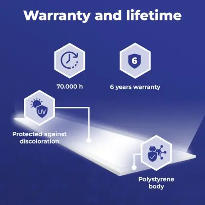 Grazie all’ottima qualità dei materiali che lo compongono, questo pannello LED manterrà il colore bianco inalterato nel tempo, anche se esposto alla luce solare. Il sistema migliorato di raffreddamento della piastra luminosa contribuirà a prolungare la durata del pannello mantenendolo sempre a una temperatura bassa.